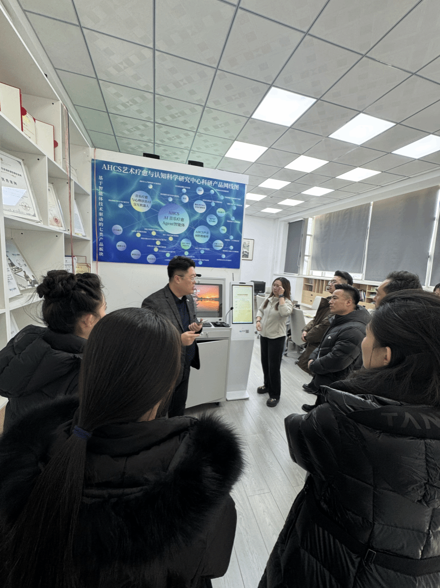 党员老师们还走访了艺术与设计学院艺术疗愈与认知科学研究中心。由研究中心主任许秋健教授为代表团详细介绍并演示了中心自主研发的“AHCS人工智能音乐疗愈诊治机器人”及“AHCS境愈声态构建系统”,前者融合情感识别与多模态交互,实现从情绪识别到音乐疏导的全流程智能疗愈;后者是国内首套“声—光—情”一体化智能环境干预系统,具备场景自适应与情绪感知功能。两项成果体现了人工智能与艺术疗愈的深度融合,已在医院、学校等多场景中得到应用。