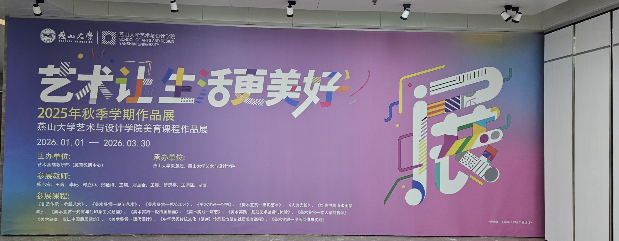 2026年1月1日,“艺术让生活更美好”2025年秋季学期美育课程作品展在燕山大学新图书馆一楼正式开展。本次展览集中展示了本学期多门美育公共选修课的优秀教学成果,涉及课程包括《非遗传承—剪纸艺术》、《美术鉴赏—织绣》、《摄影艺术》、《经典中国山水画临摹》、《美术鉴赏—梵高与后印象主义绘画》、《美术实践—轻松画插画》、《美术实践—漆艺》、《美术鉴赏—文人篆刻赏评》、《美术鉴赏—走进中国民居建筑》、《美术鉴赏—现代设计》、《中华优秀传统文化(篆刻)传承基地篆刻社团美育课程》等16门课程的学生作品。展览作品形式多样,涵盖绘画、设计、书法、工艺等多个领域,生动呈现了学校美育工作的丰硕成果。