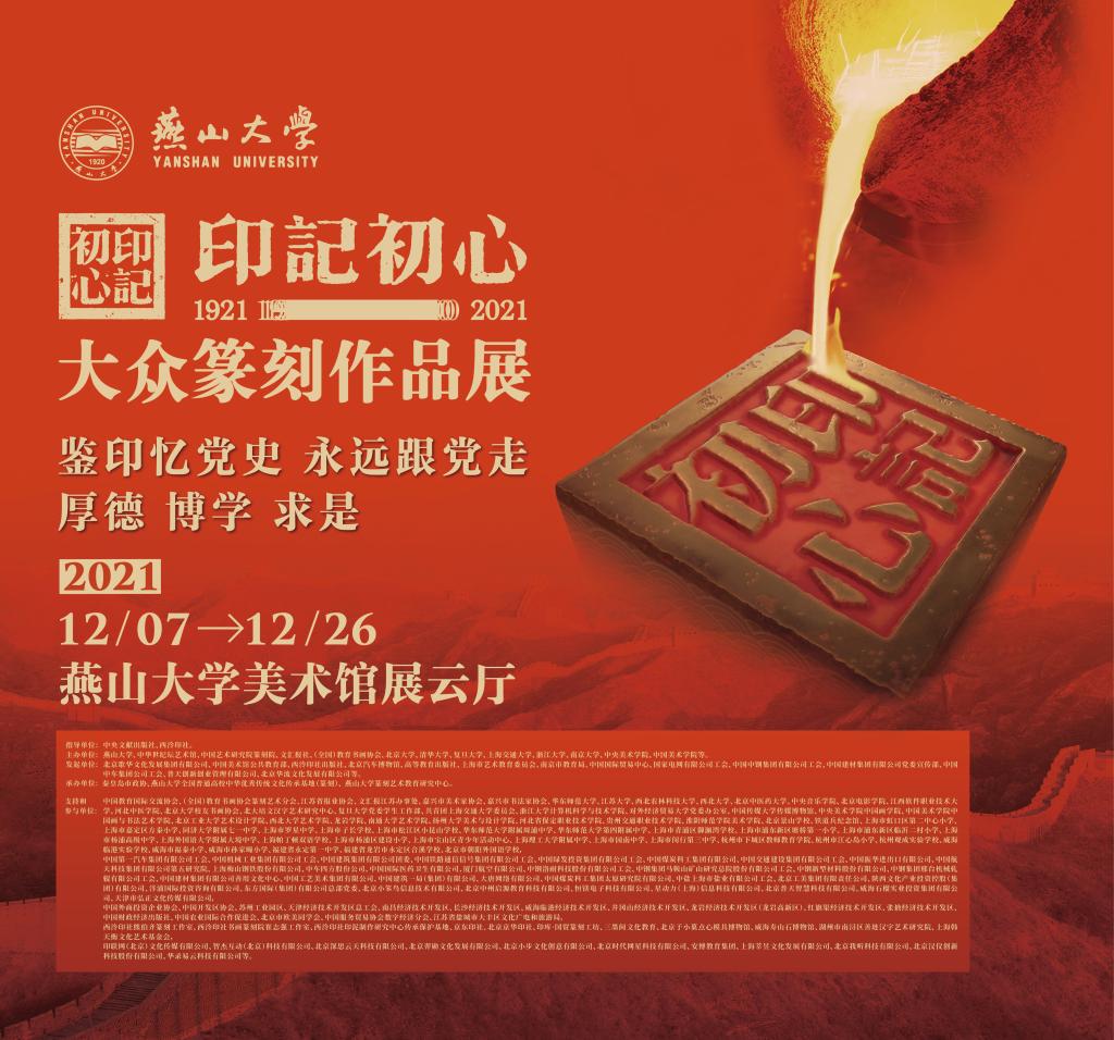 为创新形式深入开展党史学习教育,弘扬中华优秀传统文化,营造良好的校园文化氛围。以“鉴印忆党史,永远跟党走”为主题的“印记初心”——大众篆刻作品展燕山大学巡展即将开幕。本次展览将以时间为主线,通过284枚篆刻艺术作品呈现中国共产党建党100年来的伟大征程。欢迎广大师生参观。