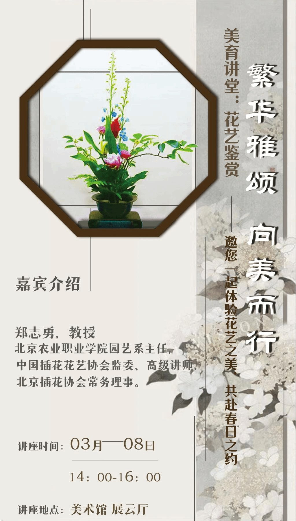 为深入贯彻习近平总书记关于美育教育的重要指示,全面落实《关于全面加强和改进新时代学校美育工作的意见》通知精神,加强五育融合,促进广大学生全方位发展,艺术与设计艺术学院将在第114个国际劳动妇女节来临之时,举办美育系列活动之花艺鉴赏:繁华雅颂,向美而行——邀您一起体验花艺之美,共赴春日之约!