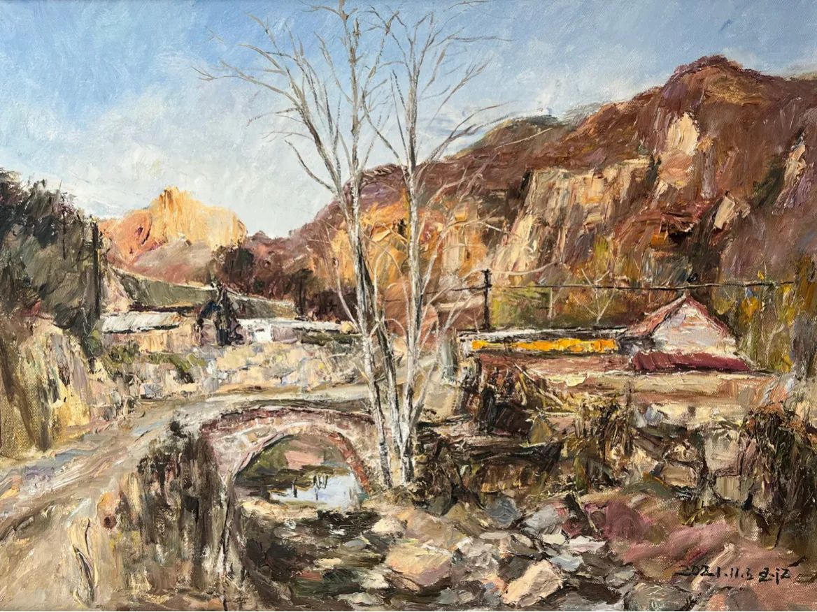 张玉江教授与我是故交,先生任教于燕山大学艺术与设计学院,主持油画艺术教学至今。他的艺术探询注重风景写生,践行于实处,坚持“写生中创作”基于现实主义审美意识。他画大东北的黑土地、燕山深处古村落、平常的静物,在色彩感受上注重情感的融入,有感于人间冷暖和岁月沉沦的痕迹,显之于笔触。他是上个世纪六十年代初生人,也是八十年代东北师范大学美术系毕业的大学生,他的画有着一代人的共同记忆和审美范式。感伤,且不失担当;朴华,且不显于技巧;凝重,且同频于时代。“笔墨当随时代”(石涛),他的艺术是一代人对于一方山水的真情坦露和端正表述。在他的油画艺术中亦能看到现实主义美术的印迹和近代中国乡土美术的抒怀。他的油画色彩沉郁、厚重,笔触朴华、灵动,显示出画者对于油画语言的高度淬炼和深刻理解,对于欧洲油画传统内在意蕴和审美范式的深入思考。他的艺术表达是真实的,这在艺术当下显得弥足珍贵;亦是朴素的,这正是一位高校教授人文修为的本色呈现。