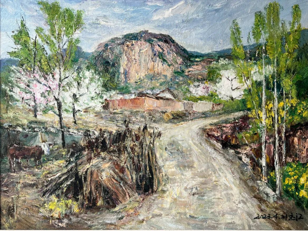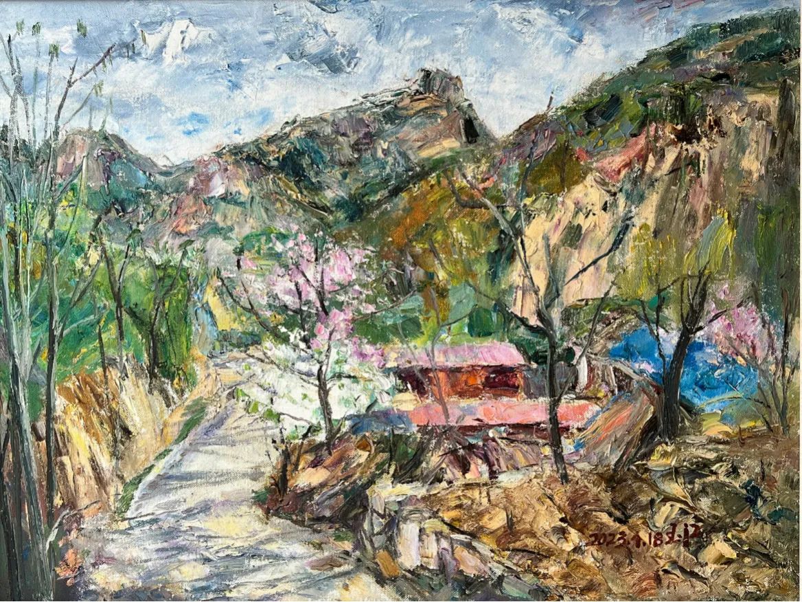“玉琢成器,江山如画”,卒读其风景油画作品,他的绘画蕴含起笔意沉凝和画者“情绪”,这亦是当代艺术的显著特征。“情绪”在德国表现主义绘画中显于呈现,是对于物象的决绝思索和深刻洞察,即“悲欣交集”的诉诸与陈述。再者他的绘画趋向于至真至诚的精神探询,在笔意的沉潜往复之间,随写进韶华尽逝和生活甘苦。他的画可以与燕山农村的百姓共鸣,有着春和景明的美好祈盼,亦有岁月钩沉的山间村野,简朴的房舍、争艳的春华,如诗如画,又感同身受。他的画有显于朴拙的一面,书论曰“宁丑毋媚,宁拙毋巧,宁支离毋轻滑,宁直率毋安排”(清 傅山),以释然之美,自由逸取,绘画亦如此。他的油画见于朴拙,见于以心写境,见性见真,且显于笔意、刀法和境界。这在传统美学的境地,有意在深化关于北方风景的参悟和践行。在百舸争流、纷繁扰攘的艺术当下,张玉江教授的画宛若一方纯粹心灵的净土,他没有趋于潮流、奢华、玄奥之风,而是关照内心,关切民间生活真实,语言朴素、平凡,犹如清风拂面,抚慰人心,向于心和。