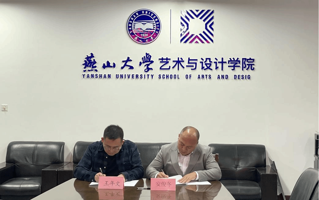 燕山大学艺术与设计学院副院长王年文、山禾海文化传媒(秦皇岛)发展有限公司董事长安俊东代表校企双方签署“燕山大学·山禾海文化产学研教学实训基地”共建协议。